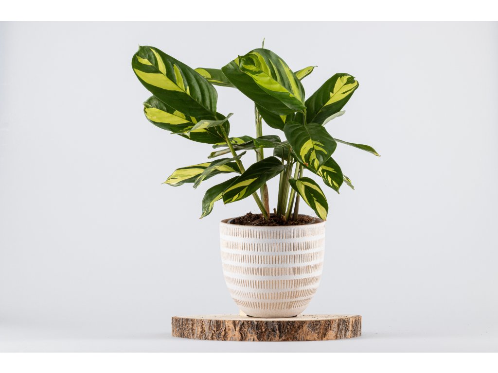 Ctenanthe 'Golden Mosaic' patří do rodiny Marantaceae – stejně jako známé calathey – a právem se řadí mezi nejzajímavější panašované rostliny. Její listy zdobí jedinečný vzor zlatavě žlutých pruhů a skvrn na zeleném podkladu, připomínající štětec malíře. Každý list je originál, a každý kus rostliny je trochu jiný – právě to z ní dělá ideální dekoraci do moderního i bohémského interiéru.
