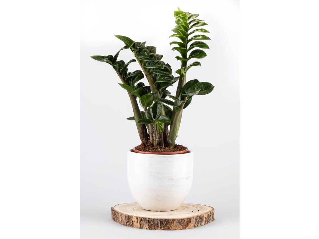 Zamioculcas zamiifolia ‘Zenzi’ je zakrslá, kompaktnější forma klasického Zamioculcasu, známého svou téměř nezničitelnou povahou. ‘Zenzi’ má krátké, silné stonky a krásně lesklé, tmavě zelené listy, které se elegantně stáčejí. Je to rostlina, která vypadá jako malá socha – a přitom nevyžaduje téměř žádnou péči.